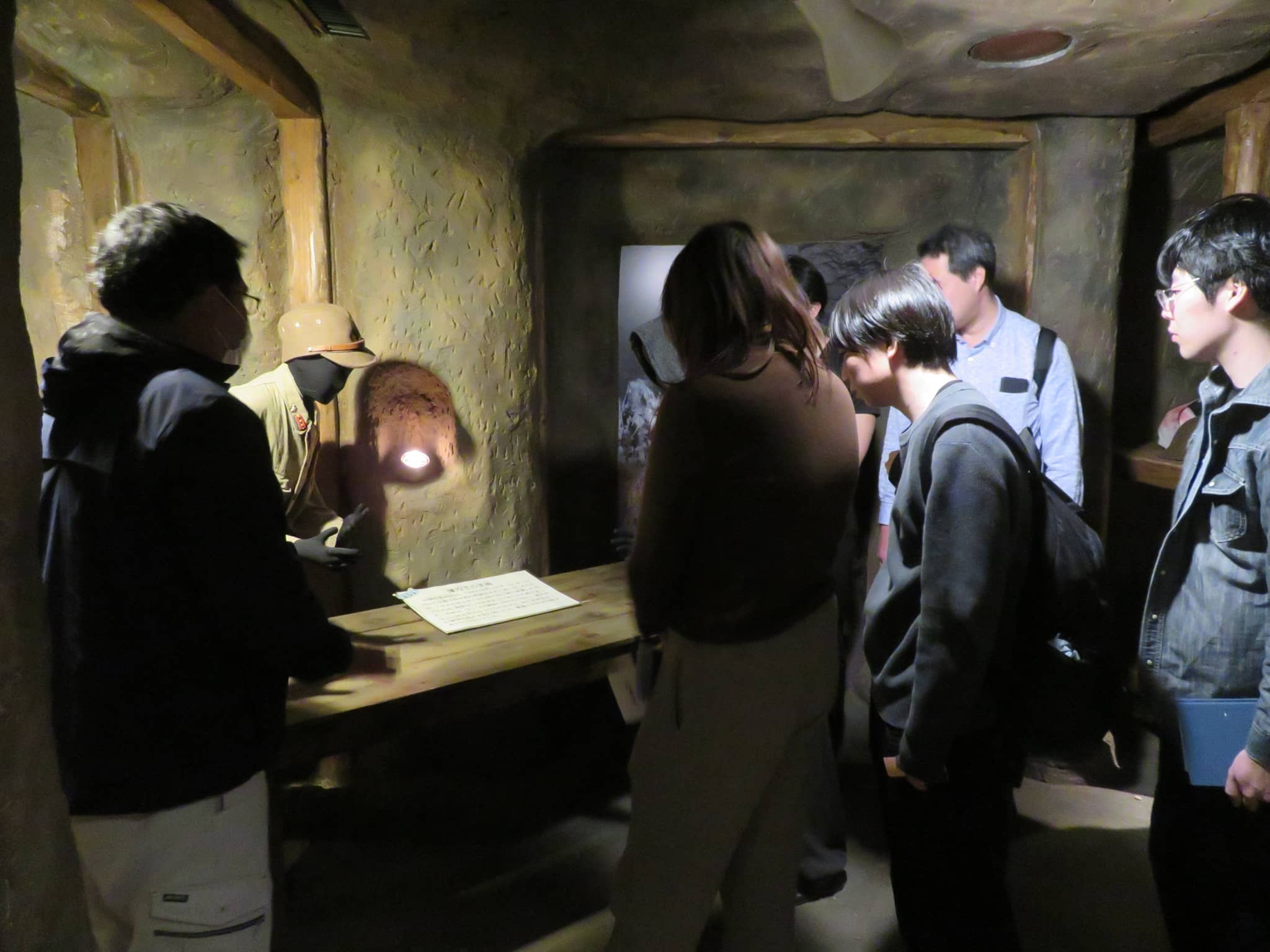 午後は、南風原町に残る沖縄陸軍病院南風原壕を見学しました。はじめに南風原文化センターにて学芸員の説明を受け(写真2)、その後、実際の壕に入り、蒸し暑く澱んだ空気と暗さの中で、学生たちは戦争の現実を体感しました(写真3)。また、田尻教授からは実際の発掘調査の様子などのエピソードも紹介され、沖縄の考古学の一端について知る機会となりました。